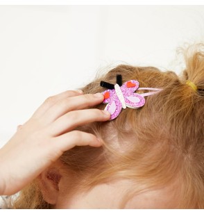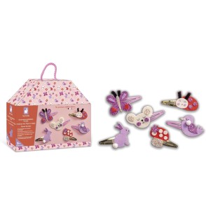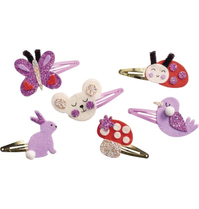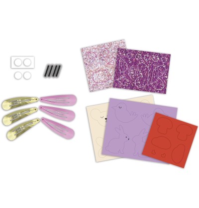 Contenu : 6 barrettes, feuilles de feutrine autocollantes, tissus pailletés, pompons, pastilles adhésives double face, livret d’instructions