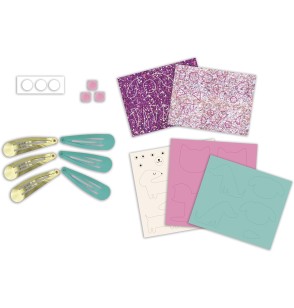 Contenu : 6 barrettes, planches de feutrine prédécoupée autocollante, planches pailletées autocollantes, pompons, pastilles autocollantes double-face, livret d’instruction