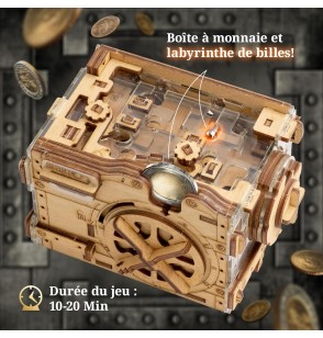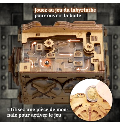 Pour l’ouvrir, il ne suffit pas d’une clé, mais d’une pièce de monnaie : insérez-la pour activer le mécanisme, puis guidez la bille à travers un labyrinthe à plusieurs niveaux. Seule la résolution complète de l’énigme permettra de libérer le compartiment secret et d’accéder à son contenu.