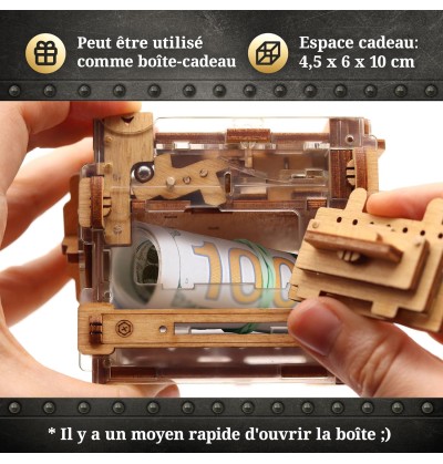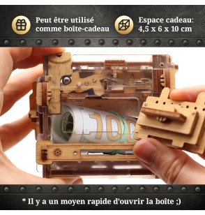 Réutilisable à volonté, cette boite peut accueillir de l’argent, un bijou ou une surprise, devenant ainsi une boîte-cadeau unique et durable. Élégante, ludique et surprenante, cette escape box promet une expérience de jeu captivante.