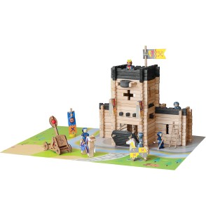 Ce superbe jeu en bois propose à votre enfant de construire un château complet : pont-levis, prison, chemin de guet, drapeaux, chevaux, et bien sûr la catapulte pour repousser les assaillants.