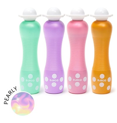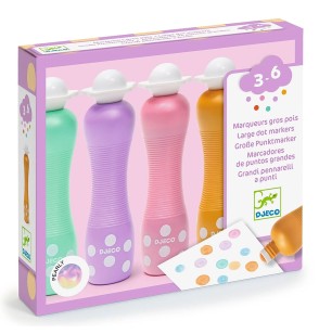 Les 4 Marqueurs Gros Pois Pearly – Djeco sont un coffret créatif pensé pour les enfants dès 3 ans qui veulent « peindre autrement ». Leur forme ergonomique, adaptée aux petites mains, permet de réaliser facilement des gros points nacrés dans quatre couleurs douces : mauve, rose, vert et jaune.