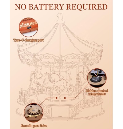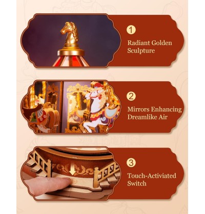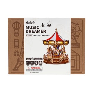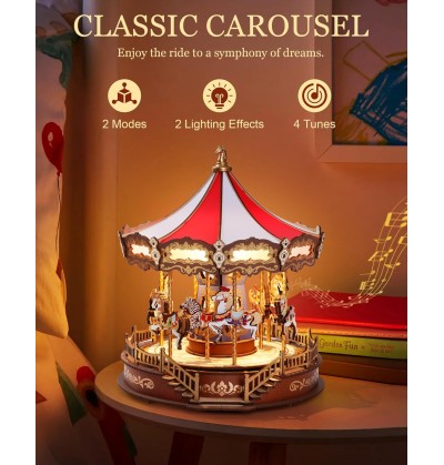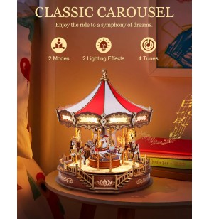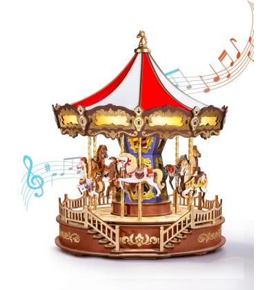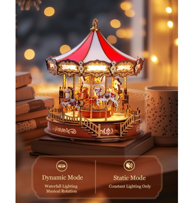 Laissez-vous bercer par la simplicité de la musique classique en regardant ce carrousel tourner. Ce puzzle 3D en bois, réaliste et authentique, offre un portrait impressionnant et raffiné d'un manège, sublimé par des lumières chaleureuses et apaisantes.