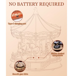Égayez votre humeur en regardant 2 modes de rotation et 2 modes d'éclairage, tout en écoutant 4 chansons classiques provenant de ce carrousel raffiné et raffiné.