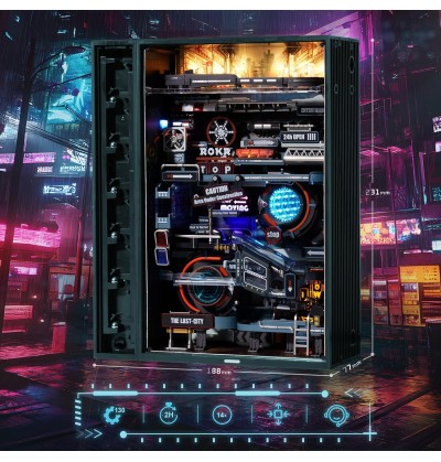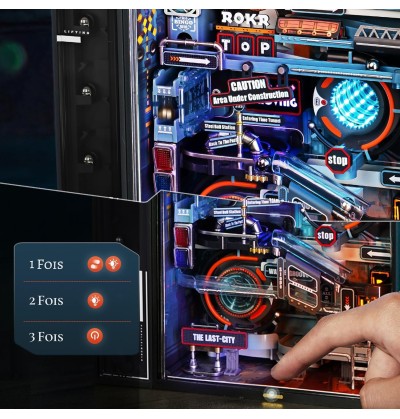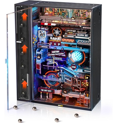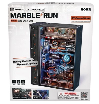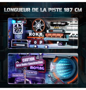 Inspirée par le jeu vidéo, l'équipe de ROKR a amélioré les pistes traditionnelles de course de billes avec un design cyberpunk. Les billes passeront à travers une longueur de piste de 187 cm de scènes futuristes.