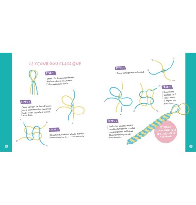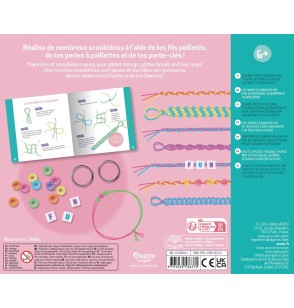 Contenu du coffret : 50 fils de scoubidou pailletés + perles décoratives + livret explicatif avec modèles