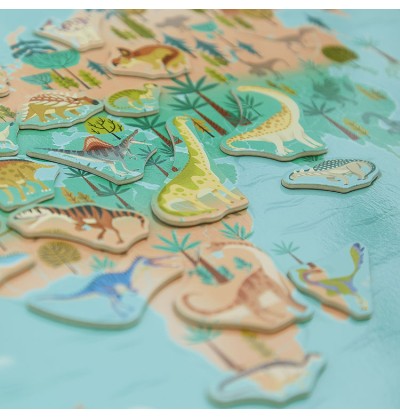 Ce planisphère magnétique présente une carte du monde colorée, peuplée de 50 dinosaures en bois à placer aux endroits où ils ont vécu. Chaque aimant représente une espèce différente, permettant aux enfants de découvrir la répartition géographique des dinosaures à travers les continents.