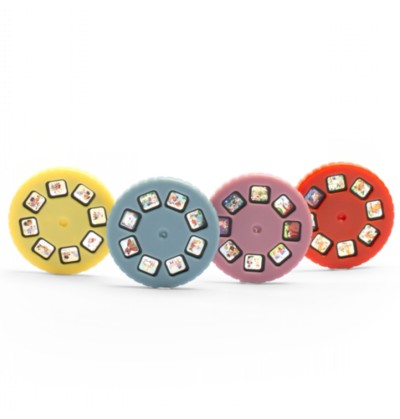 Tournez le disque manuellement pour faire défiler les images, une à une, et ainsi créer votre propre récit à voix haute. Chaque disque contient 8 images, pour un total de 4 histoires différentes.