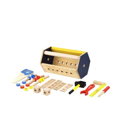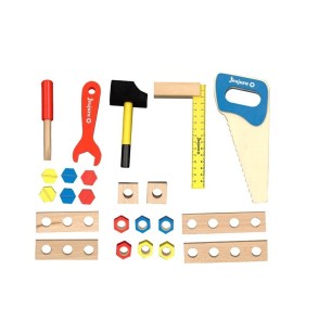 Cette très belle mallette contient de nombreux accessoires en bois : un marteau, une scie, un tournevis, une clé, une équerre, ainsi qu’un mini kit de bricolage avec plaques perforées, vis et écrous à assembler pour fabriquer ou réparer comme les grands.