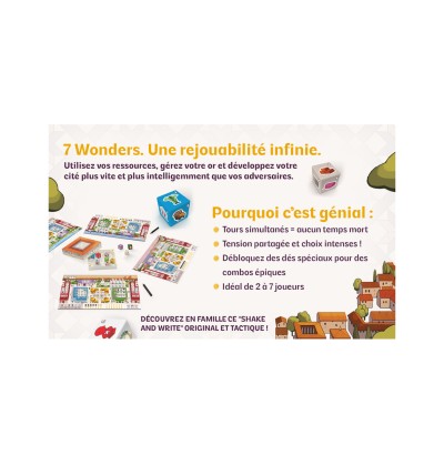 On aime : La fluidité du jeu : mise en place rapide, règles claires, parties dynamiques. Le matériel complet et soigné qui offre une belle expérience tactile et visuelle. La profondeur stratégique surprenante pour un format rapide – on sent que les décisions comptent sans pour autant alourdir le jeu. Cette mécanique convient aussi bien aux amateurs de jeux de stratégie qu’aux joueurs occasionnels. Le thème civilisation/merveille reste toujours aussi séduisant, et cette version dés apporte un souffle nouveau à la série. Enfin, peu de jeux proposent des parties jusqu'à 7 joueurs, c'est parfait pour les soirées où l'on est un peu nombreux, pour ne laisser personne de côté !