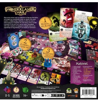 On aime : Le jeu est top, il y a beaucoup de règles mais une fois lues, ça passe tout seul. Tout le monde joue en même temps et le matériel est super. Wonderland’s War propose une riche expérience ludique, dans un univers déjanté et coloré. Tous les personnages ont des capacités différentes à débloquer et des jetons avec des capacités uniques à obtenir. Chaque personnage a donc sa façon unique d’être jouée et offre une sensation de montée en puissance tout au long de la partie, ce qui vous fera jouer différemment à chaque fois!