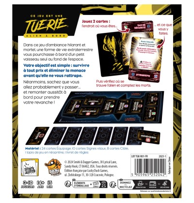 Ce Jeu est une Tuerie : Alien à Bord est un jeu d'ambiance pour 3 à 10 joueurs. Dans ce jeu cartes bourré d'humour, prenez les choses au second degré et fuyez une forme extraterrestre qui tente de vous éliminer. Et si elle y arrive... recommencez pour prendre votre revanche !