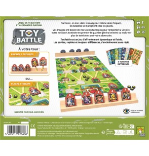 Toy Battle est un jeu d'affrontement pour 2 joueurs. Dans ce jeu de société, vos troupes ont besoin de votre talent tactique pour les mener à la victoire. Votre mission ? Soyez le premier à atteindre le quartier général ennemi ou à contrôler plus de territoires que votre adversaire.