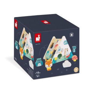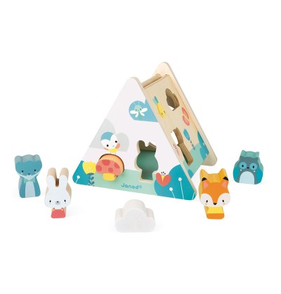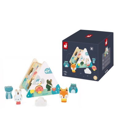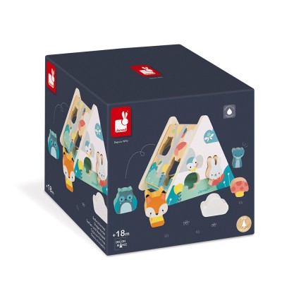La Boîte à Formes Pure de Janod est un jouet d’éveil en bois conçu pour les enfants dès 18 mois. Avec son design en forme de tipi et ses couleurs douces, elle invite les tout-petits à insérer six pièces en bois (un renard, un lapin, une chouette, un ours, un champignon et un nuage) dans les découpes correspondantes.