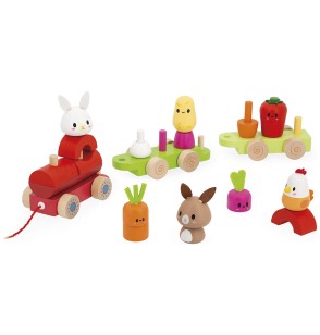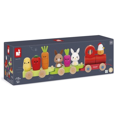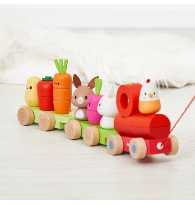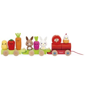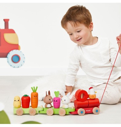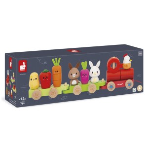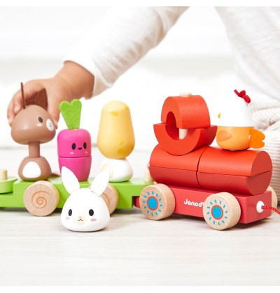 Dès 12 mois, votre bout de chou pourra empiler légumes et animaux, puis tirer son train partout dans la maison — du salon jusqu’à la cuisine, si ça l’amuse (et c’est souvent le cas) !