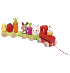 Embarquez pour un voyage rigolo à travers la ferme avec ce Train à Tirer de la Ferme signé Janod.