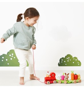 Ce jouet d’éveil 2-en-1 invite l’enfant à construire, manipuler et découvrir : 3 wagons amovibles + 19 pièces colorées à assembler (lapins, poule, légumes pimpants…) pour stimuler la motricité fine. Ensuite, place à l’aventure : grâce à sa ficelle, le train se promène, encourageant les premiers pas et développant la motricité globale.