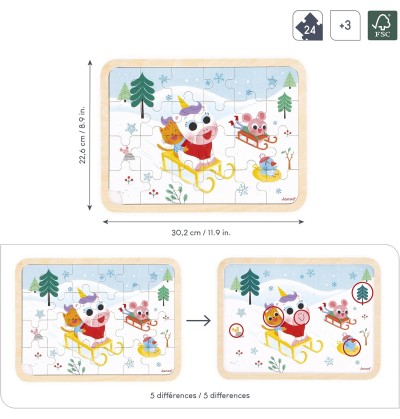 Le modèle du puzzle est imprimé sur le fond du plateau, pour aider les enfants dans sa réalisation. Idéal pour apprendre les noms des animaux de la ferme et ravir les fans de licornes, ce puzzle en bois invite les petits à faire preuve de déduction. Comment ? En incluant un jeu des différences ! Il y a 5 différences qui se sont glissées sur l’illustration du puzzle : amusez-vous à les retrouver en famille !
