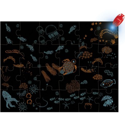 On commence par reconstituer ce puzzle aux couleurs douces puis on allume la petite lampe magique fournie pour espionner pieuvres, anémones et méduses dans leur vie nocturne !