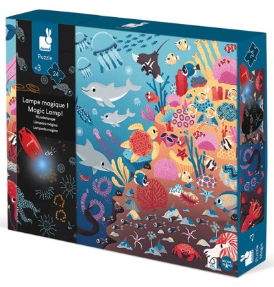 Avec ses 24 pièces solides et faciles à manipuler, ce puzzle invite les enfants à explorer un décor océanique vibrant… mais ce n’est pas tout ! Grâce à la lampe magique fournie, ils pourront révéler des éléments cachés et découvrir une multitude de petits détails dissimulés dans l’illustration.