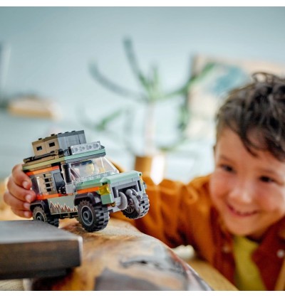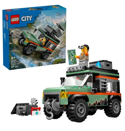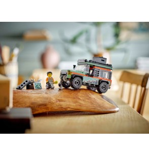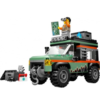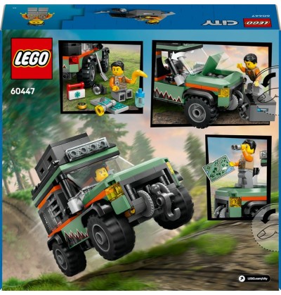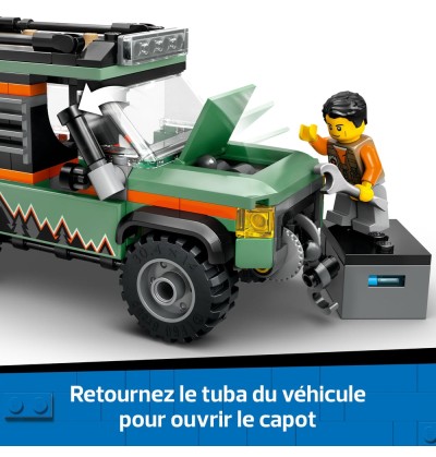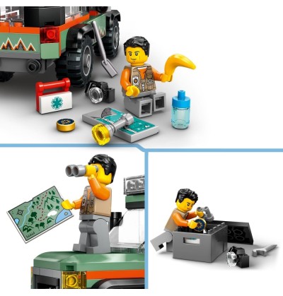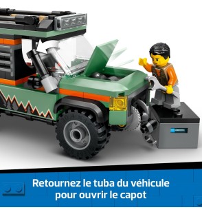 Le véhicule tout‑terrain est équipé de pneus imposants, d’un treuil fonctionnel à l’avant pour gravir les pentes escarpées, d’une benne de toit chargée d’outils et d’une calandre snorkel qui se relève pour accéder à la mécanique. Une figurine d’aventurier et plusieurs accessoires (carte, jumelles, lampe de poche) enrichissent le jeu de rôle et font vivre des histoires de nature, de camping sauvage et de terrain accidenté.