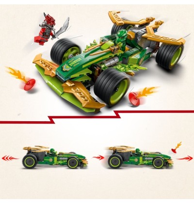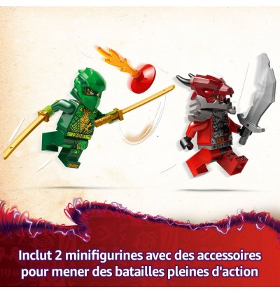 Le set inclut deux minifigurines : Lloyd, armé de deux katanas dorés, et un Guerrier draconique avec son sabre, ce qui permet de simuler des duels ou des courses palpitantes. Deux éléments lumineux sont également fournis pour aménager un petit parcours d’obstacles visant à tester la réactivité et la vitesse du véhicule.