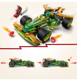 Il suffit de tirer le bolide vers l’arrière pour libérer toute sa vitesse, puis imaginer Lloyd à bord, prêt pour une course épique. La voiture est dotée de quatre pneus robustes, d’un cockpit pour accueillir la figurine, et d’éléments verts en forme d’éclair qui renforcent le style ninja.