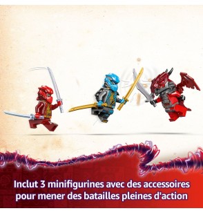 Les ailes et pièces mobiles ajoutent une dimension spectaculaire au jeu. Le set inclut trois minifigurines – Kai en version ninja, Nya en alliée agile et un Guerrier draconique redoutable – chacune équipée d’armes adaptées pour les affrontements. Grâce à cette configuration, les enfants peuvent alterner entre combats rapprochés, courses effrénées et transformations impressionnantes.