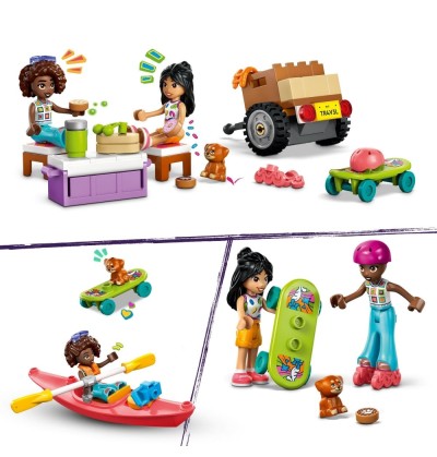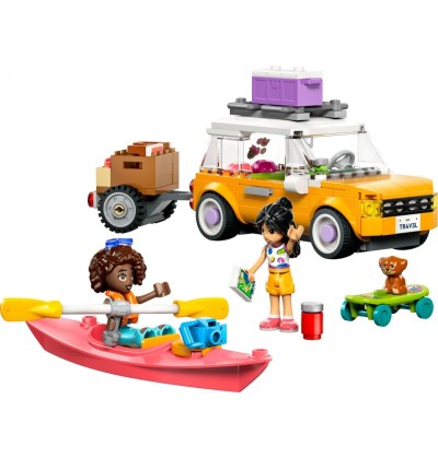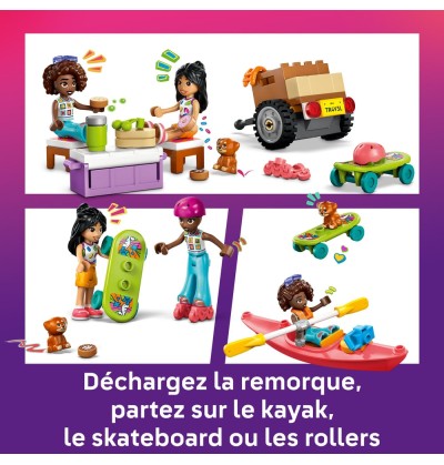 Le véhicule principal est une voiture à construire, attachée à une remorque chargée d’équipements de départ : kayak, skateboard, patins à roulettes, façade de pique‑nique et plus encore. Deux mini‑poupées (Liann et Aliya) prennent place à bord tandis qu’un chiot accompagne la virée derrière la voiture.