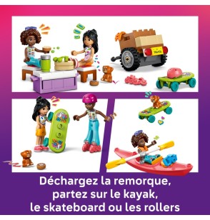 Le décor et les nombreux accessoires – glacière‑table, casques, chaises de camping, gilet de sauvetage – invitent à inventer des scénarios variés : chargement du véhicule, arrêt au bord d’un lac pour un kayak, pause goûter, course en skate ou rollers. Le modèle favorise l’imagination, la coordination manuelle et le jeu d’amitié.