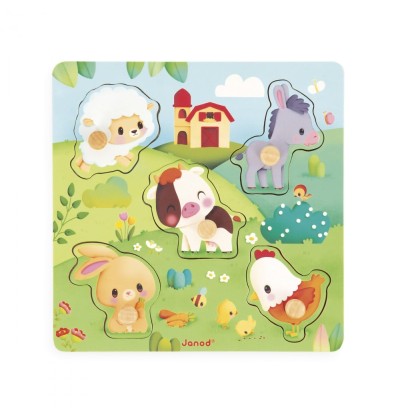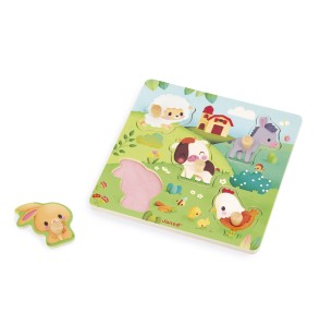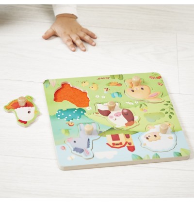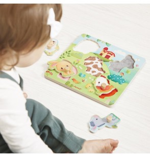 Contenu : 1 puzzle en bois de 5 pièces tactiles (mouton, vache, âne, poule, lapin)