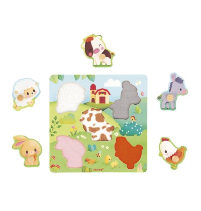 Avec le Puzzle Tactile Ferme Janod, les tout-petits partent en balade à la campagne à la rencontre des animaux de la ferme… mais pas seulement à les voir : à les toucher !