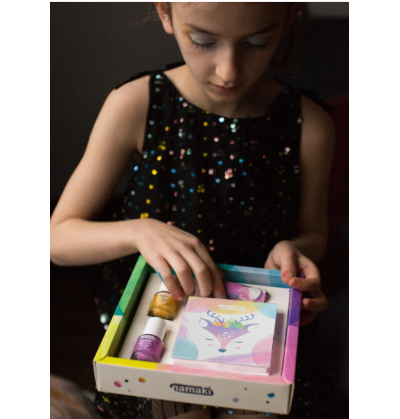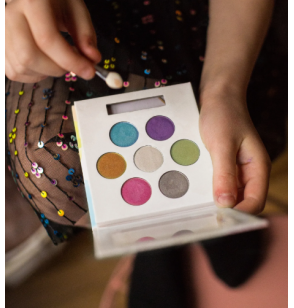 On y découvre une magnifique palette de sept fards à paupières aux tons chauds et nacrés, un baume à lèvres à la framboise délicatement teinté de rose, et deux vernis à ongles pelables dans des nuances Or et Mauve. De quoi illuminer chaque journée, que ce soit pour une fête, un spectacle ou simplement pour s’amuser à briller.