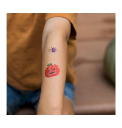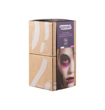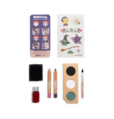 Dans un seul coffret, on trouve une palette trois couleurs (noir, blanc, vert), deux crayons violets et roses pour souligner ou créer des détails saisissants, un flacon de faux sang pour les effets choc, une planche de tatouages éphémères qui s’assemble avec l’éponge effets spéciaux et un pinceau cosmétique pour peaufiner les maquillages.