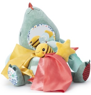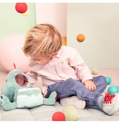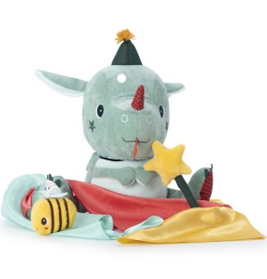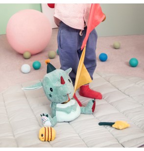 Cette peluche douce et colorée, en forme de dragon, offre une variété d'activités pour stimuler les sens de bébé. Elle est équipée d'un miroir sous le menton, d'un hochet en forme de baguette magique, d'un ami le bourdon en peluche avec papier bruissant, et de trois foulards colorés à tirer. De plus, la tête de Joe s'ouvre pour révéler un miroir caché, ajoutant une touche de surprise et d'émerveillement.