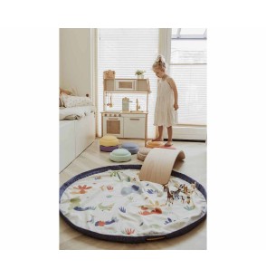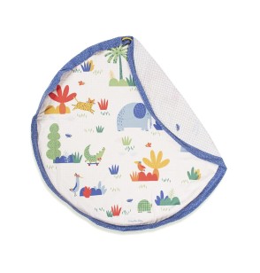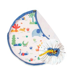 Confectionné en tissu très résistant, il devient un tapis de jeu lorsqu'on desserre les liens. Dés que l'enfant a fini de jouer, il suffit de resserrer les liens et tout est rangé !